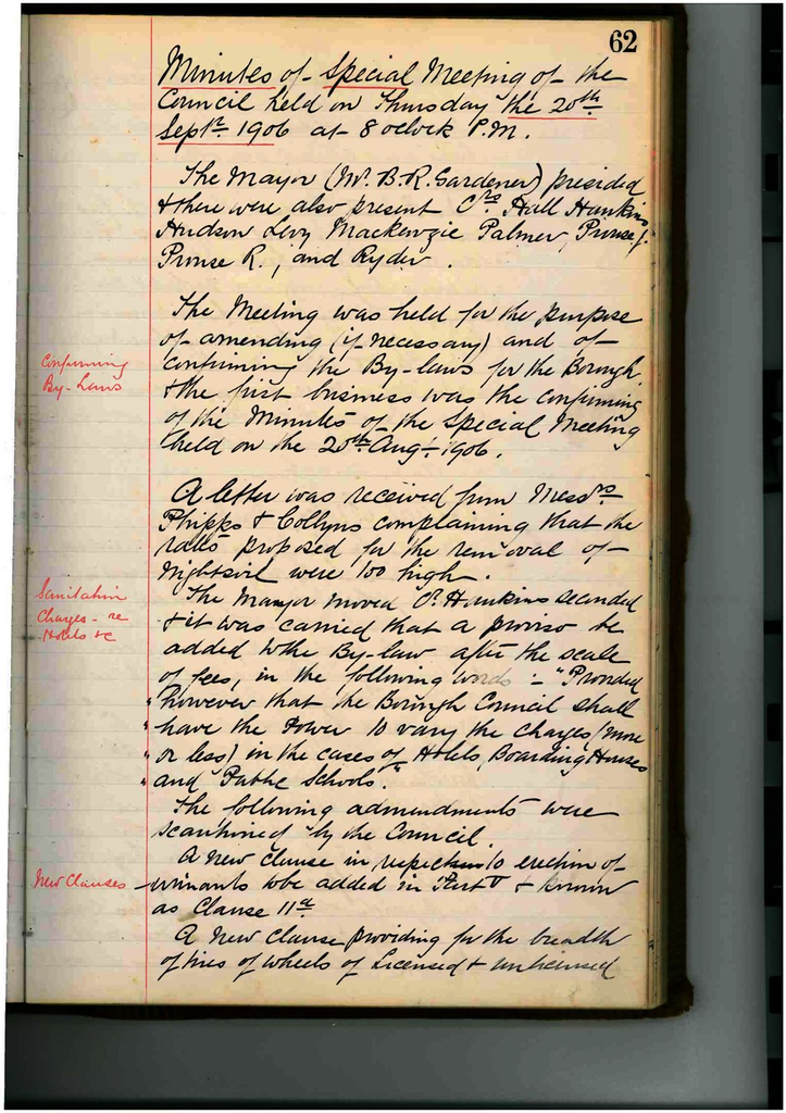 The Meeting was held for the purpose of amending (if necessary) and of confirming the by-laws for the Borough. The first business was the confirming of the Minutes of the Special Meeting held on the 20th August 1906.