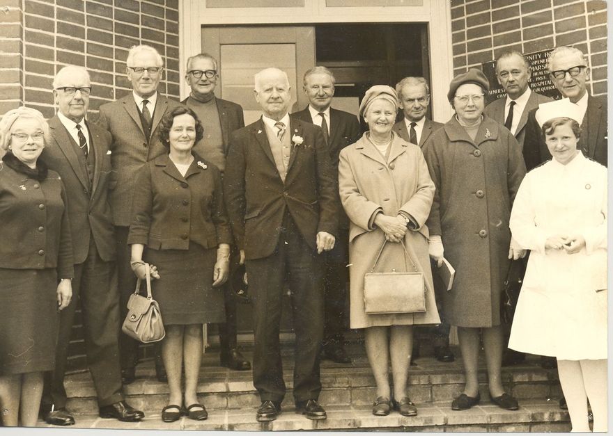 Penciled on back - Members of the P.N. Hospital Board at the Levin Maternity Home. From left. Mrs E.M. Kingston, Messrs W.B. Tennant, J. Rowan, Mrs M.G. Thevenard, Messrs R.A. Hopwood, E.N. Rowe, R.S. Wilson (sec.), Mrs H.M. Blake, Mr K.R. Archer (medical superintendent), Miss A. Stonehouse (ass. sec.), Dr A.G. Cumming, Mr A.R. McKegg (chairman) and sister J.T. Jackson (matron of the maternity home). Wed. 23 July 1969.