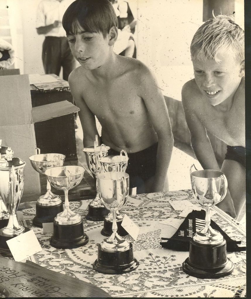 Peter Sim and Michael Lyons looking at cups to be presented for the various events at the St Josephs Convent School swimming sports. 1 B&W photo print