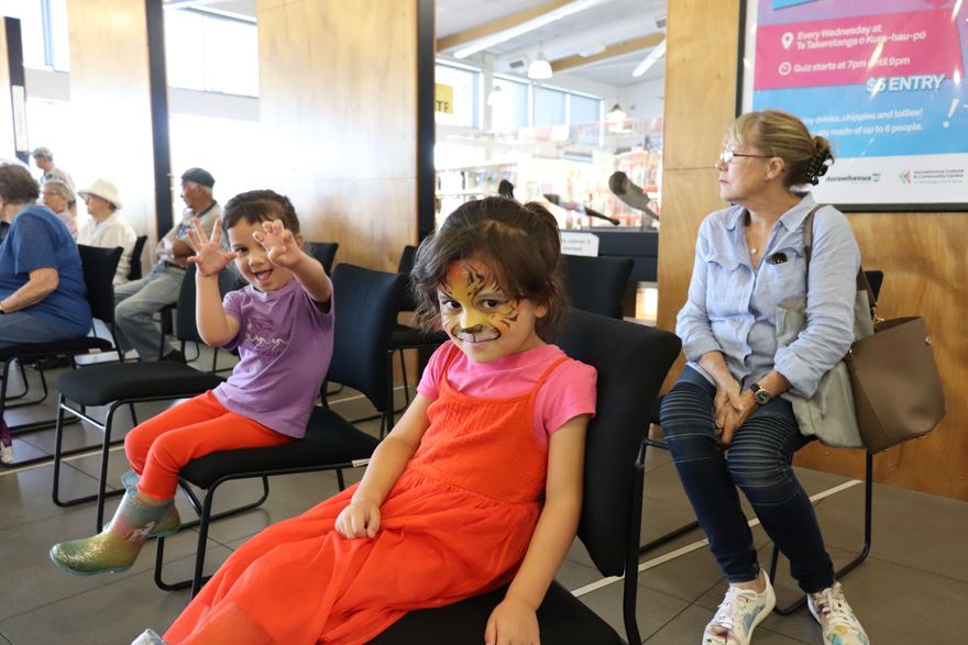 Pictured: Rune and Lyra de la Croix (aged 4) and the crowd, waiting for the Chinese Dragon Dance to begin. Main Space at Te Takeretanga o Kura-hau-pō.
