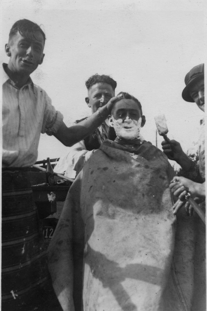 First woolpack produced by Woolpack and Textiles being used as a shaving towel. Three men prepare a fourth man to be shaved.
