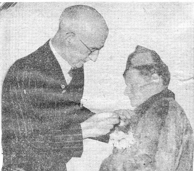 Captain M S Galloway, secretary-general of the NZ Red Cross Society, pins a service medal on Miss H E Bowen's coat in recornition of 30 years work for the Society in Levin.