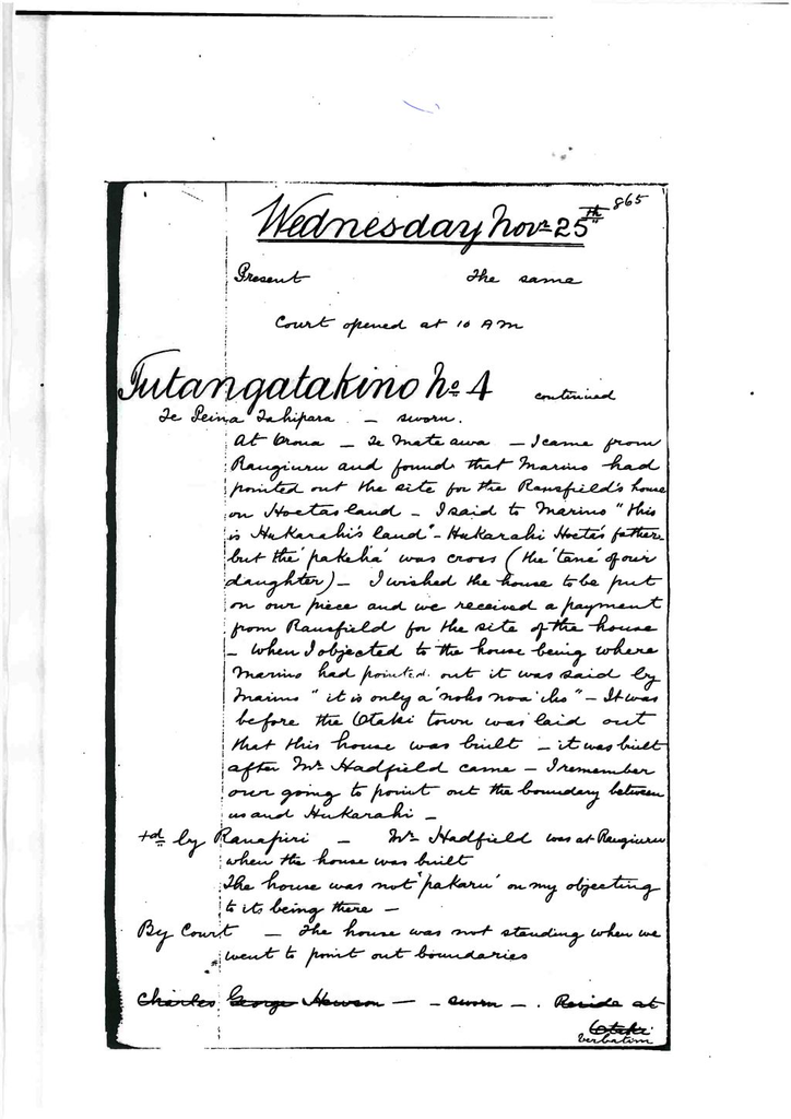 At Oroua – Te Mate awa – I came from Rangiuru and found that Marino had pointed out the site for the Ransfield’s house on Hoeta’s land. I said to Marino “this is Hukarahi’s land”. Hukarahi Hoeta’s father but the pakeha was cross (the ‘tane’ of our daughter). I wished the house to be put on our piece and we received a payment from Ransfield for the site of the house. When I objected to the house being where Marino had pointed out t was said by Marino “it is only a ‘noho noa iho”. It was before the Otaki town was laid out that this house was built. It was built after Mr. Hadfield came. I remember our going to point out the boundary between us and Hukarahi.
