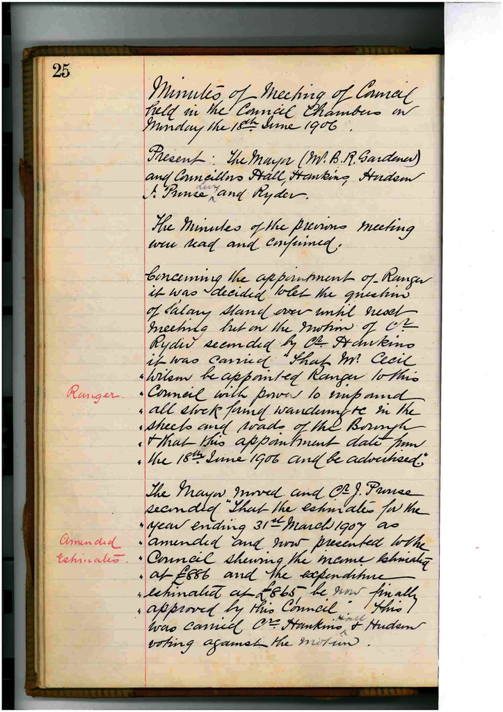 Concerning the appointment of Ranger it was decided to let the question of salary stand over until next meeting but on the motion of Cr Ryder seconded by Cr Hankins it was carried “that Mr Cecil Wilson be appointed Ranger to this Council with power to impound all stock found wandering in the streets and roads of the Borough and that this appointment date him from the 18th June 1906 and be advertised.”