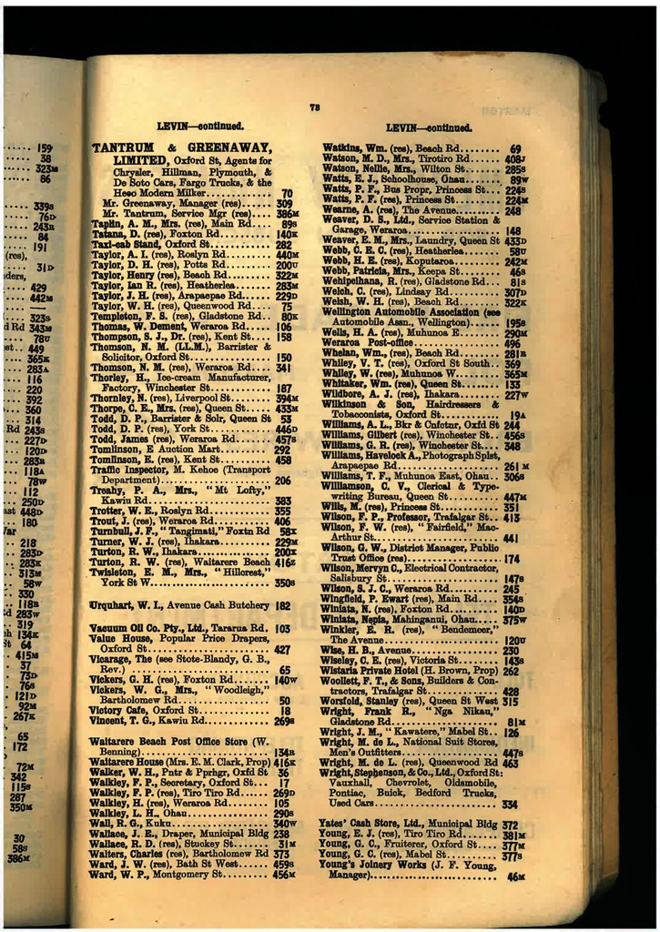 Name No. TANTRUM & GREENAWAY, LIMITED, Oxford St, Agents for Chrysler, Hillman, Plymouth, & De Soto Cars, Fargo Trucks, & the Heco Modern Milker 70 - Mr. Greenaway, Manager (res) 309 - Mr. Tantrum, Service Mgr (res) 386M Taplin, A. M., Mrs. (res), Main Rd 89S Tatana, D. (res), Foxton Rd 140K Taxi-cab Stand, Oxford St 282 Taylor, A. I. (res), Roslyn Rd 440M Taylor, D H (res), Potts Rd 200U Taylor, Henry (res), Beach Rd 322M Taylor, Ian R. (res), Heatherlea 283M Taylor, J. H. (res), Arapaepae Rd 229D Taylor, W. H. (res), Queenwood Rd 75 Templeton, F. S. (res), Gladstone Rd 80K Thomas, W. Dement, Weraroa Rd 106 Thompson, S. J. Dr. (res) Kent St 158 Thomson, N. M. Dr. (LL.M.) Barrister & Solicitor, Oxford St 150 Thomson, N. M. (res), Weraroa Rd 341 Thorley, H. Ice-cream Manufacturer, Factory, Winchester St 187 Thornley, N. (res), Liverpool St 394M Thorpe, C. E., Mrs. (res), Queen St 433M Todd, D. P., Barrister & Solr, Queen St 53 Todd, D. P. (res), York St 446D Todd, James (res), Weraroa Rd 457S Tomlinson, E Auction Mart 292 Tomlinson, E. (res). Kent St 458 Traffic Inspector, M. Kehoe (Transport Department) 206 Treahy, P. A., Mrs., " Mt Lofty," Kawiu Rd 383 Trotter, W. E., Roslyn Rd 355 Trout, J. (res), Weraroa Rd 406 Turnbull, J. F., " Tangimati," Foxtn Rd 58X Turner, W. J. (res), Ihaka 229M Turton, R. W. Ihakara 200X Turton, R. W. (res), Waitarere Beach 416Z Twisleton, E. M., Mrs., " Hillcrest," York St W 350S Urquhart, W. I., Avenue Cash Butchery 182 Vacuum Oil Co. Pty., Ltd., Tararua Rd 103 Value House, Popular Price Drapers, Oxford St 427 Vicarage, The (see Stote-Blandy, G. B, Rev.) 65 Vickers, G. H. (res), Foxton Rd 140W Vickers, W. G., Mrs., " Woodleigh," Bartholomew Rd 50 Victory Cafe, Oxford St 18 Vincent, T. G., Kawiu Rd. 269S Waitarere Beach Post Office Store (W Benning) 134R Waitarere House (Mrs. E. M. Clark, Prop) 416K Walker, W. H., Pntr & Pprhgr, Oxfd St 36 Walkley, F. P., Secretary, Oxford St 17 Walkley, F. P. (res), Tiro Tiro Rd 269D Walkley, H. (res), Weraroa Rd 105 Walkley, L. H.. Ohau 290S Wall, R. G., Kuku 340W Wallace, J. B., Draper, Municipal Bldg 238 Wallace, R. D. (res), Stuckey St 31M Walters, Charles (res), Bartholomew Rd 373 Ward, J. W. (res), Bath St West 459S Ward, W. P., Montgomery St 456M Watkins, Wm. (res), Beach Rd 69 Watson, M. D., Mrs., Tirotiro Rd 408J Watson, Nellie, Mrs., Wilton St 285S Watts, E. J., Schoolhouse, Ohau 89W Watts, P. F., Bus Propr, Princess St 224S Watts, P. F. (res), Princess St 224K Wearne, A. (res), The Avenue 248 Weaver, D. S., Ltd., Service Station & Garage, Weraroa 148 Weaver, E. M., Mrs., Laundry, Queen St 433D Webb, C. E. C. (res), Heatherlea 58U Webb, H. E. (res), Koputaroa 242M Webb, Patricia, Mrs., Keepa St 46S Wehipeihana, R. (res), Gladstone Rd 81S Welch. C. (res), Lindsay Rd 307D Welsh, W. H. (res), Beach Rd 322K Wellington Automobile Association (see Automobile Assn., Wellington) 195S Wells, H. A. (res), Muhunoa E 290M Weraroa Post-office 496 Whelan, Wm., (res), Beach Rd 281R Whiley, V. T. (res), Oxford St South 369 Whiley, W. (res), Muhunoa W 365M Whitaker, Wm. (res), Queen St 133 Wildbore, A. J. (res), Ihakara 227W Wilkinson & Son, Hairdressers & Tobacconists, Oxford St 19A Williams, A. L., Bkr & Confetnr, Oxfd St 244 Williams, Gilbert (res), Winchester St 456S Williams, G. R. (res), Winchester St 348 Williams, Havelock A., Photograph Splst, Arapaepae Rd 261M Williams, T. F., Muhunoa East, Ohau 306S Williamson, C. V., Clerical & Typewriting Bureau, Queen St 447M Wills, M. (res), Princess St 351 Wilson, F. P., Professor, Trafalgar St 413 Wilson, F. W. (res), "Fairfield," MacArthur St 441 Wilson, G. W., District Manager, Public Trust Office (res) 174 Wilson, Mervyn C., Electrical Contractor, Salisbury St 147S Wilson, S. J. C., Weraroa Rd 245 Wingfield, P. Ewart (res), Main Rd 354S Winiata, N. (res), Foxton Rd. 140D Winiata, Nepia, Mahinganui, Ohau 375W Winkler, E. R. (res), " Bendemeer," The Avenue 120U Wise, H. B., Avenue 230 Wiseley, C. E. (res), Victoria St 143S Wistaria Private Hotel (H. Brown, Prop) 262 Woollett, F. T., & Sons, Builders & Contractors, Trafalgar St 428 Worsfold, Stanley (res), Queen St West 315 Wright, Frank R., " Nga Nikau," Gladstone Rd 81M Wright, J. M., " Kawatere," Mabel St 126 Wright, M.de L., National Suit Stores, Men's Outfitters 447S Wright, M. de L. (res), Queenwood Rd 463 Wright, Stephenson, & Co., Ltd., Oxford St: Vauxhall, Chevrolet, Oldsmobile, Pontiac, Buick, Bedford Trucks, Used Cars 334 Yates' Cash Store, Ltd., Municipal Bldg 372 Young, E. J. (res), Tiro Tiro Rd 381M Young, G. C., Fruiterer, Oxford St 337M Young, G. C. (res), Mabel St 377M Young's Joinery Works (J. F. Young, Manager) 46M