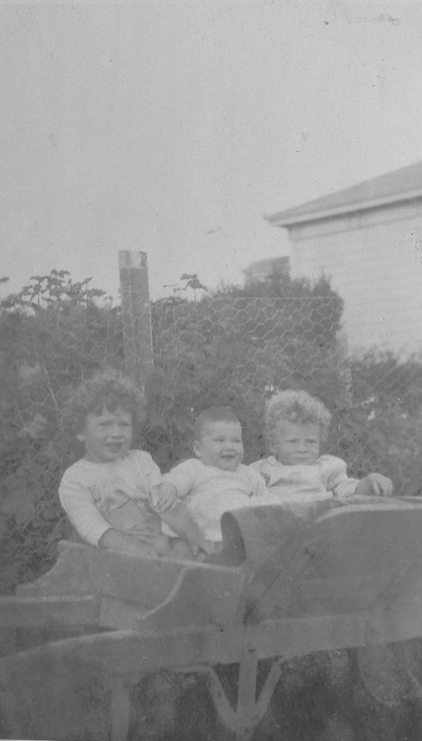Stewart, Jean, and Jack Carmichael all sitting in a wooden wheel barrow.