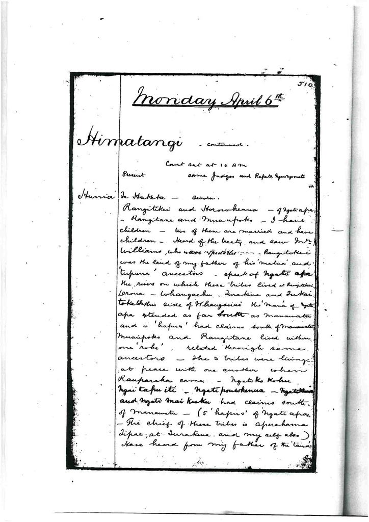 Hunia Te Hakeke – sworn – Rangitikei and Horowhenua – of Ngati Apa – Rangitane and Muaupoko –I have children – two of them are married and have children – heard of the treaty and saw Mr. Williams, who were spectacles – Rangitikei was the land of my father of his ‘matua’ and ‘tupuna’ ancestors – speak of Ngati Apa the rivers on which these tribes lived at Rangitikei Oroua – Whangaehu – Turakina and Tukai take this side of Whanganui the ‘mana’ of Ngati Apa extended as far south as Manawatu and 4 ‘hapu’s’ had claims south of Manawatu – Muaupoko and Rangitane lived within one ‘rohe’ – related through same ancestors – the 3 tribes were living at peace with one another when Rauparaha came – Ngati Kokohu – Ngai Tapi iti – Ngatipouwhenua – Ngati[unknown tribe/sub tribe] and Ngati Mai Kuku had claims south of Manawatu – (5 ‘Hapu’s’ of Ngati Apa – the chief ofthese tribes is Aperahama Tipae at Turakina and myself also) – have heard from my father of the land