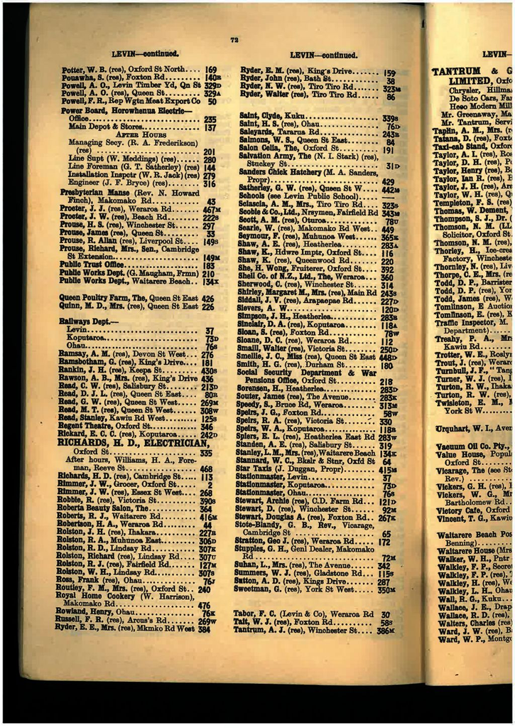 Potter, W. B. (res), Oxford St North 169 Pouawha, S. (res), Foxton Rd 140R Powell, A. 0., Levin Timber Yd, Qn St 329D Powell, A. 0. (res), Queen St 329A Powell, F. R., Rep Wgtn Meat Export Co 50 Power Board, Horowhenua Electric —Office. 235 -- Main Depot & Stores 137 AFTER HOURS Managing Secy. (R. A. Frederikson) (res) 201 Line Supt (W. Meddings) (res) 280 Line Foreman (G. T. Satherley) (res) 144 Installation Inspctr (W. R. Jack) (res) 279 Engineer (J. F. Bryce) (res) 316 Presbyterian Manse (Rev. N. Howard Finch), Makomako Rd 43 Procter, J. J. (res), Weraroa Rd 467M Procter, J. W. (res), Beach Rd 222S Prouse, H. S. (res), Winchester St 297 Prouse, James (res), Queen St 33 Prouse, R. Allan (res), Liverpool St 149S Prouse, Richard, Mrs., Sen., Cambridge St Extension 149M Public Trust Office 183 Public Works Dept. (G. Maugham, Frmn) 210 Public Works Dept., Waitarere Beach 134X Queen Poultry Farm, The, Queen St East 426 Quinn, M. D., Mrs. (res), Queen St East 226 Railways Dept.— Levin 37 Koputaroa 73D Ohau 76S Ramsay, A. M. (res), Devon St West 276 Ramsbotham, G. (res), King's Drive 181 Rankin, J. H. (res), Keeps St 430S Rawson, A. B., Mrs. (res), King's Drive 436 Read, C. W. (res), Salisbury St 213D Read, D. J. L. (res), Queen St East 80R Read, G. W. (res), Queen St West 269M Read, M. T. (res), Queen St West 308w 308W Read, Stanley, Kawiu Rd West 125S Regent Theatre, Oxford St 346 346 Rickard, E. C. C. (res), Koputaroa 242D RICHARDS, H. D., ELECTRICIAN, Oxford St 335 335 After hours, Williams, H. A., Foreman, Reeve St 468 Richards, H. D. (res), Cambridge St 113 Rimmer, J. W., Grocer, Oxford St 2 Rimmer, J. W. (res), Essex St West 268 Robbie, R. (res), Victoria St 390S Roberta Beauty Salon, The 364 Roberts, R. J, Waitarere Rd 416M Robertson, H. A., Weraroa Rd 44 Rolston, J. H. (res), Ihakara 227R Rolston, R. A., Muhunoa East 306D Rolston, R. D., Lindsay Rd 307K Rolston, Richard (res), Lindsay Rd 307U Rolston, R. J. (res), Fairfield Rd 127M Rolston, W. H., Lindsay Rd 307S Ross, Frank (res), Ohau. 76J Routley, F. M., Mrs. (res), Oxford St 240 Royal Home Cookery (W. Harrison), Makomako Rd 476 Rowland, Henry, Ohau 76K Russell, F. R. (res), Arcus's Rd 269W Ryder, E. E., Mrs. (res), Mkmko Rd West 384 Ryder, E. M. (res), King's Drive 159 Ryder, John (res), Bath St 38 Ryder, N. W. (res), Tiro Tiro Rd 323M Ryder, Walter (res), Tiro Tiro Rd 86 Saint, Clyde, Kuku 339S Saint, H. S. (res), Ohau 76D Saleyards, Tararua Rd 243R Salmons, W. S., Queen St East 84 Salon Celia, The, Oxford St 191 Salvation Army, The (N. I. Stark) (res), 191 Stuckey St 31D Sanders Chick Hatchery (M. A. Sanders, Propr) 429 Satherley, G. W. (res), Queen St W 44aM Schools (see Levin Public School) -- Sciascia, A. M„ Mrs., Tiro Tiro Rd 323S Sobie & Co., Ltd., Nrsymen, Fairfield Rd 343M Scott, A. M. (res), Oturoa 78U Searle, W. (res), Makomako Rd West 449 Seymour, F. (res), Muhunoa West 365K Shaw, A. E. (res), Heatherlea 283A Shaw, K., Hdwre Imptr, Oxford St 116 Shaw, K. (res), Queenwood Rd 220 She, H. Wong, Fruiterer, Oxford St 392 Shell Co. of N.Z., Ltd., The, Weraroa 360 Sherwood, C. (res), Winchester St 314 Shirley, Margaret M., Mrs. (res), Main Rd 243S Siddall, J. V. (res), Arapaepae Rd 227D Sievers, A. W 120D Simpson, J. H., Heatherlea. 283R Sinclair, D. A. (res), Koputaroa 118A Sloan, S. (res), Foxton Rd 78W Sloane, D. C. (res), Weraroa Rd 112 Smaill, Walter (res), Victoria St 250D Smellie, J. C., Miss (res), Queen St East 448D Smith, H. G. (res), Durham St 180 Social Security Department & Pensions Office, Oxford St 218 Sorensen, H., Heatherlea 283D Souter, James (res), The Avenue 283K Speedy, S., Bruce Rd, Weraroa 313M Speirs, J. G., Foxton Rd. 58W Speirs, R A (res), Victoria St 330 Speirs, W. A., Koputaroa 118R Spiers, E. L. (res), Heatherlea East 283W Standen, A. E. (res), Salisbury St 319 Stanley, L. M., Mrs. (res),Waitarere Beach 134K Stannard, W. C., Bkslr & Stnr, Oxfd St 64 Star Taxis (J. Duggan, Propr) 415M Stationmaster, Levin 37 Stationmaster, Koputaroa 73D Stationmaster, Ohau 76S Stewart, Archie (res), CD. Farm Rd 121D Stewart, D. (res), Winchester St 92M Stewart, Douglas A. (res), Foxton Rd 267K Stote-Blandy, G. B., Rev., Vicarage, Cambridge St 65 Stratton, Geo 3. (res), Weraroa Rd 172 Stupples, G. H., Genl Dealer, Makomako Rd 72M Suhan, L., Mrs. (res), The Avenue 342 Summers, W. J. (res), Gladstone Rd 115S Sutton, A D. (res), Kings Drive 287 Sweetman, G. (tea), York St West 350M Tabor, F.C. (Levin & Co), Weraroa Rd 30 Tait, W.J. (res) Foxton Rd 58S Tantrum, A.J, (res) Winchester St 386M