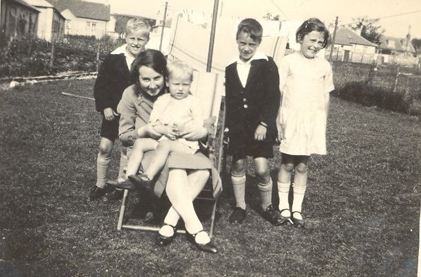 In the back yard with four children. A woman has the smallest child on her knee.