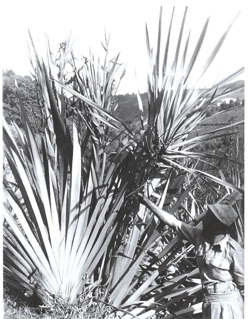 One of 9 photographs of flax (phormium tenax) and other plants taken by Uncle of Mrs M Illes. Man on left holding plant