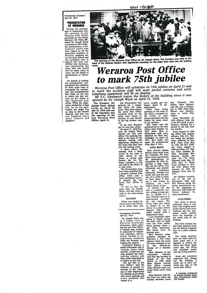 The premier, Sir Joseph Ward, visited Levin on April 20 and 21, 1910 and one of the functions was the opening of the Weraroa Post Office, April 21.
