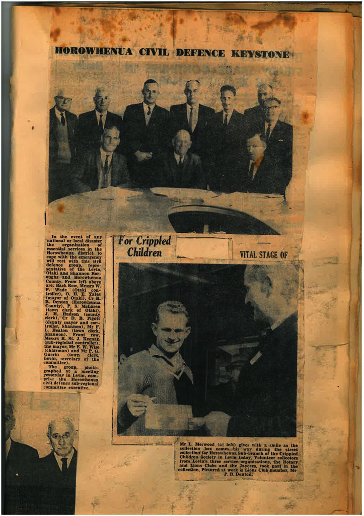 Top Photo - "Horowhenua Civil Defence Keystone" - Photo from left Back row - Messrs W P Wade (Otaki controller), O H E Yates (mayor of Otaki), Cr R B Denton (Horowhenua County), P S McLaren (town clerk of Otaki), J H Hudson (county clerk), Cr D B Pigott (deputy mayor and controller Shannon), Mr F L Heaton (town clerk Shannon . Front Row - Messrs R St J Keenan (sub-regional controller), the mayor Mr E W Wise (chairman), Mr P G Guerin (town clerk, Levin, secretary of the committee).