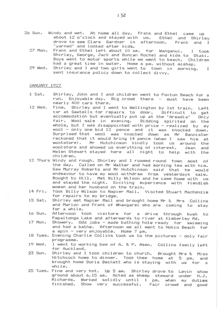 Jan. 1 Sat. Shirley, John and I and children went to Fox-ton Beach for a run. Enjoyable day. Big crowd there - must have been nearly 400 cars there. Jan. 12 Wed. Fine. Shirley and I went to Wellington by 1st train. Left car at Sawtells for repairs to door. Difficult to get accommodation but eventually put up at the 'Arcadia' Only fair. Wool sale in evening. Bidding spirited on the whole, but I was disappointed with price - realized by my wool - only one bid 13 pence and it was knocked down. Surprised that wool was knocked down as Mr Bannister reckoned that it would bring 14 pence when I saw him at woolstore. Mr Hutchinson kindly took us around the woolstore and showed us everything of interest. Jean and Helen Stewart stayed here all night to help with the children. Jan. 13 Thurs. Windy and rough. Shirley and I roamed round town most of the day. Called on Mr Walker and had morning tea with him. Saw Murray Roberts and Mr Hutchinson said that he would endeavour to have my wool withdraw from yesterdays sale. Bought by Hill. Met Billy Wilson and he came home with us and stayed the night. Exciting experience with fiendish woman and her husband on the train. Jan. 14 Fri. Took Billy Wilson to Napier Mail. Visited Stuart MacKenzie for repairs to my bridge. Jan. 15 Sat. Shirley met Napier Mail and brought home Mr & Mrs Collins and Marion and Frank of Whangarei who are coming to stay for a while. Jan. 16 Sun. Afternoon took visitors for a drive through bush to Papaitonga Lake and afterwards to river at Kimberley Rd. Jan. 17 Mon. Showery. Odd jobs - made bathing hole ready for swimming and had a bathe. Afternoon we all went to Hokio Beach for a spin - very enjoyable. Home 7 pm. Jan. 18 Tues. Evening Charlie Collins took us to the pictures - only fair programme. Jan.19 Wed. I went to working bee of A. & P. Assn. Collins family left for Auckland. Jan. 23 Sun. Shirley and 1 took children to church. Brought Mrs & Miss Hitchcock home to dinner. Took them home at 5 pm. and brought home Doris Beckett who is staying with us for a while. Jan. 25 Tues. Fine and very hot. Up 5 am. Shirley drove to Levin show ground about 6.15 am. Acted as sheep steward under H.J. Richards. Worked solidly until 1 pm. when my duties finished. Show very successful. Fair crowd and good competition. I was steward on fat sheep and southdowns for which Mr McLeod was judge. Wed. Show Day. Very hot. We all went to Levin Show. Big crowd. Tremendous tot of tars. Shirley and George both entered in car competitions and George did fairly well in driving competition. Jan. 29 Sat. Doris, Jack, Lois, Anne and I went to Levin in morning - bank and shopping. Jessie Craig left us tonight to be married an Feb. 9th. Jan. 30 Sun. Fine and very hot. Did not go out. Spent most of day in our bathing suits. Jan. 31 Mon. Up at 5am and got everything ready to go to take John to the Agricultural High School where he is spending year. Left Dick in charge of Tui and Cliffe. Left Doris in Levin where she caught motor bus to Wellington. Took 2 hours to go to Feilding arriving there at 11 am. Shirley, Lois, Anne and Buster stayed at Mrs Hassalls and John and I took Alb Kellow to lunch. Afterwards Shirley and I took John down to the school and interviewed the Director, Mr Wild who showed us round. John compared very favourably with rest of new boys. Afternoon tea at Mrs Hassalls - called at Park and Vi Kellow and the children. Left Fending 5 pm. arrived Levin 42.45. No accidents either way. Ray Jones turned up and commenced to repair verandah. George assisted him. Feb. 1 Tues. Ray turned up and continued the verandah. I assisted him a little before going to sale. Decided to go on with small room on verandah for sleeping porch. Feb. 2 Wed. Ray came and we put in all day at the building. George and I put down the west verandah. Ray put up frame and started on ceiling. Feb. 4 Fri. George and I practically finished rustic. Ray finished ceiling, put on inside lining (3ft) I put down part of front verandah. Stewart girls over and Willie came over for them in evening. Feb. 6 Sun. After dinner we had a visit from Mr & Mrs M. Port Percy, Cecil and Miss Friend who came up from Wellington to see us. They stayed about 3 hours. Feb. 7 Mon. Ray did not come to work. George and I finished front verandah and then commenced to paint and made fair progress. Feb. 9 Wed. We all went painting most of the day. Ray did gables and afterwards window sashes. Shirley took Lois and Anne to D.S. MacKenzie. Treatment for Lois.