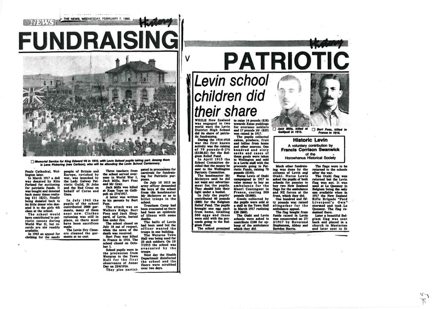Much other fundraising was done by the citizens of Levin and Otaki. Nurse Lewis asked the pupils of both schools for pennies to buy two New Zealand flags for the ambulance and NZ forces at the front, which they did.
