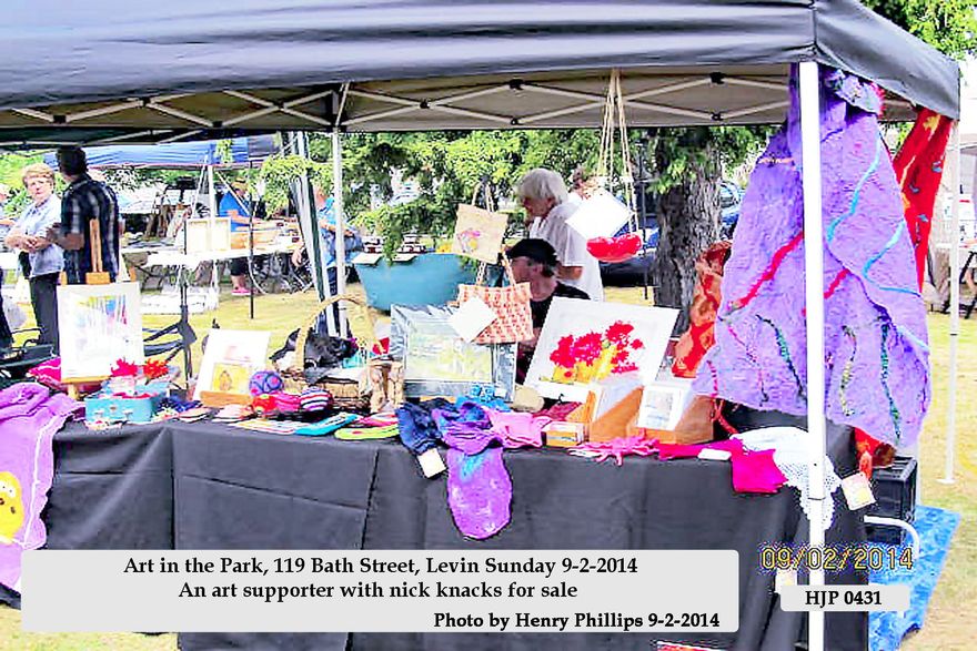 HJP 0431 Art in the Park, 119 Bath Street, Levin Sunday 9-2-2014 An art supporter with nick knacks for sale