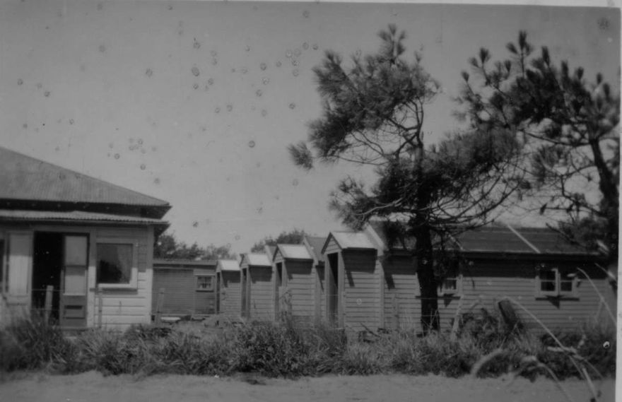 Foxton Beach Holiday House Darwick Street, bought by Mrs M H Short in 1936. This building was previously the Womens Institute Rest Home. To the right of the photograph are ex U S hospital units, which were added as cabins in 1946.