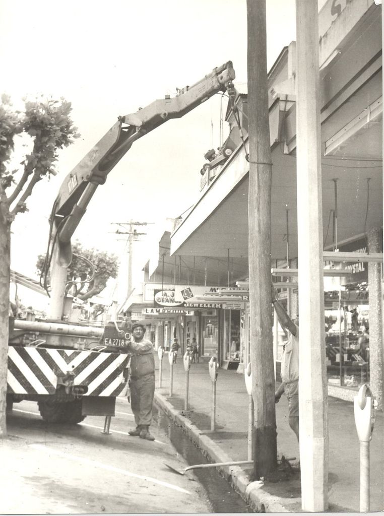Western side of Oxford Street, between Queen and Bath Streets. Truck mounted crane being used to lift the poles out of the ground. 2 workmen (unidentified).