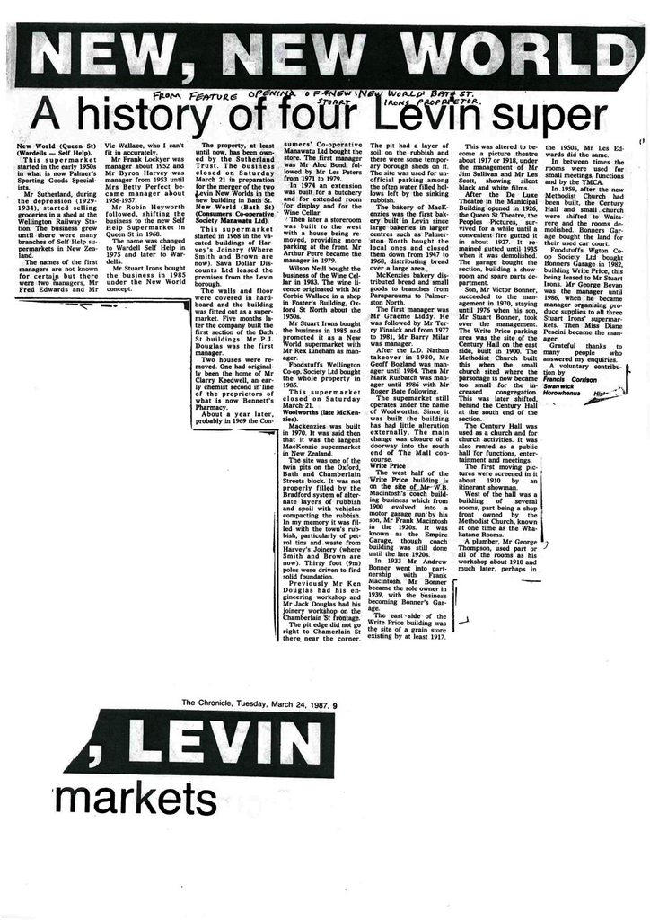 The property, at least until now, has been owned by the Sutherland Trust. The business closed on Saturday March 21 in preparation for the merger of the two Levin New Worlds in the new building in (Bath St) (Consumers Co-operative Society Manawatu Ltd).