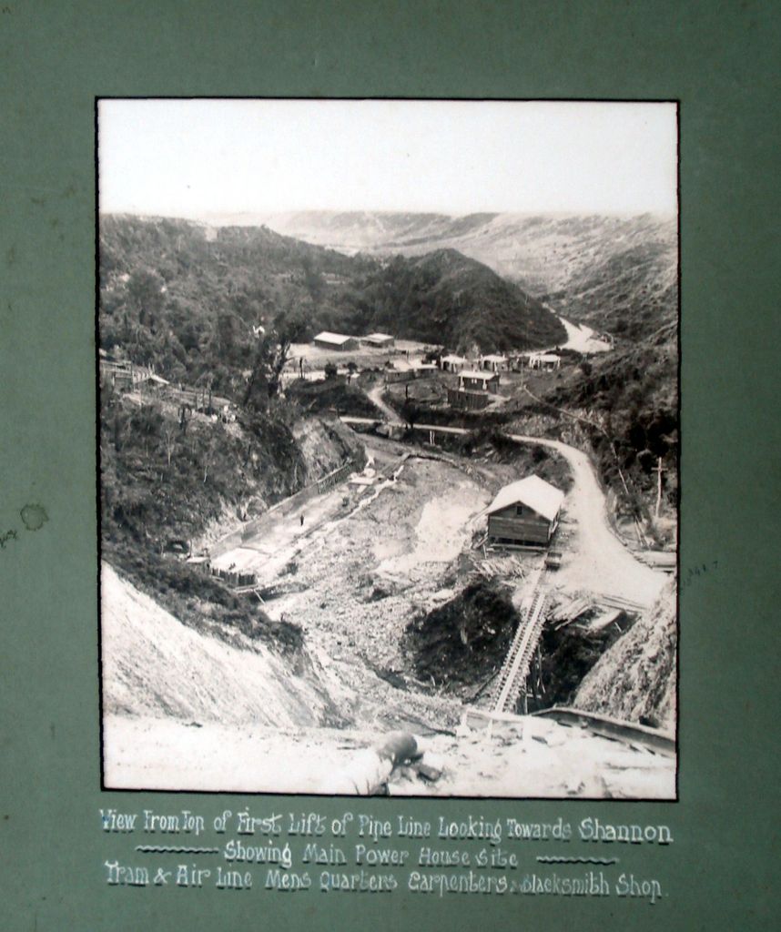 Printed with white paint (?) below photo as caption - View From Top of First Lift of Pipe Line Looking Towards Shannon ~~~~ Showing Main Power House Site ~~~~ Tram & Air Line Mens Quarters Carpenters&Blacksmith Shop.