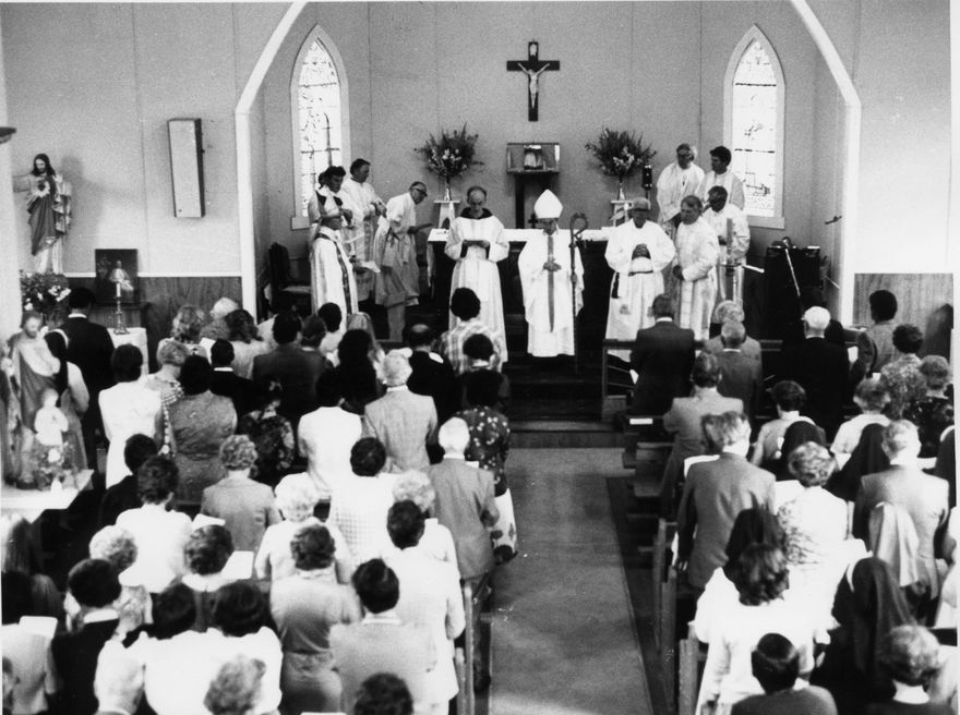 The blessing by Bishop Peter Cullinane at St Marys centenary, 14 November 1981. This photograph looks towards the alter and shows celebrants and congregation.