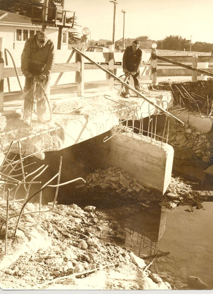 Contractors’ employees, Mr R. Smith & Mr J. Hobbs, preparing the Kuku Bridge (State Highway 1) over the Kuku Stream for widening by between 6 & 8 feet.