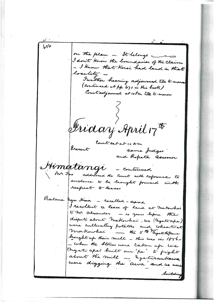 I recollect a lease of land at Makowhai to Mr. Alexander 4 years before the dispute about Makowhai. We (Ngatiapa) were cultivating potatoes and wheat at Makowhai. The 5th year, Ngatiraukawa brought up their mill. This was in 1856. When the stones were taken up, we (Ngatiapa) built our ‘pa’ to fight about the mill. Ngatiraukawa were digging the ‘awa’ and we were building our ‘pa’. When the embankments of the ‘pa’ were built the stones were brought by Ngatiapa to the ‘pare pare’ of the ‘pa’. This was done because if Ngatiraukawa had come to take them to their ‘awa’ ‘kua whawhai tonu I reira’. Ngatiapa kept the stones. The dispute increased and Nepia went and settled it. Ngati Raukawa ceased to ‘kiri’ their ‘awa’ and returned – the stones were left – are broken. It is false what was stated by a witness that Nepia allowed Ngatiapa to join in a lease to enable them to raise money to join in building the mill. It was not Nepia who arranged the lease. First lease of Makowhai was granted to Mr. Alexander in 1858. We (the Ngatiapa) agreed with Mr. Alexander for him to occupy Makowhai. Alexander consented. A lease was written. £60 a year was the rent agreed on to be paid half yearly for 19 years. After the lease was written Alexander paid down £30. Young Nepia heard and I heard went to Alexander and his men to intimidate him and got money and I heard that he got £5. In 1859, we received a second £60. Nepia also went to the ‘pakeha’s’ and asked for a portion and they gave him £5. In 1860 we again received £60. When I took the money to Parewanui, the Ngatiapa chiefs held a meeting to consider about Nepia’s going to the ‘pakeha’s’ ot ‘whakawehi wehi’ and to get money. Mohi Mahi said “I propose that £10 of this money should be taken to Nepia and that he be requested to cease applying to the ‘pakeha’s’”. This was done. Mohi Mahi then said to me “you take the £10 to Nepia and our message, that he cease to interfere”. I took the money to Matahiuri, found Nepia there, ill, also Kuruho and young Nepia. I gave the message. Old Nepia said “it is well. It is not my doing. It is young Nepia”. He then told his son he must cease to interfere. Kuruho and young Nepia assented. In 1861, I leased Taikoria to Treweek. The land joined Makowhai lease. Treweek agreed to lease. We wrote to Kerei and Te Peeti – Rangitane. They came up and we went together to Whanganui to Treweek. Churton was our interpreter. We had a conversation and Treweek agreed to the terms we propose.