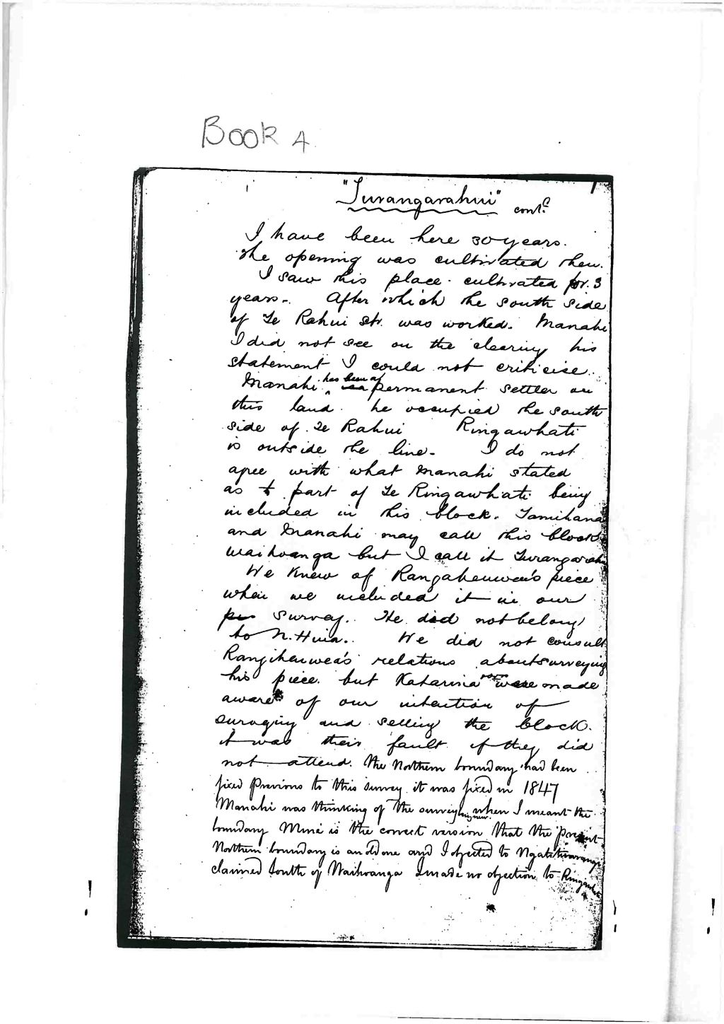 I saw this place cultivated for 3 years. After which the south side of Te Rahui Stn was worked. Manahi, I did not see on the clearing – his statement, I could not criticise. Manahi has been a permanent settler on this land. He occupied the south side of Te Rahui. Ringawhati is outside the line. I do not agree with what Manahi stated as to part of Te Ringawhati being included in this block. Tamihana and Manahi may call this block Waihoanga but I call it Turangariahui.