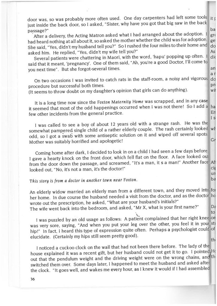Coming home after dark, I decided to look in on a child I had seen a few days before. I gave a hearty knock on the front door, which fell flat on the floor. A face looked out from the door down the passage, and screamed, "It's a man, it s a man!" Another face Afi looked out, "No, it's not a man, it's the doctor!"This story is from a doctor in another town near Foxton.
