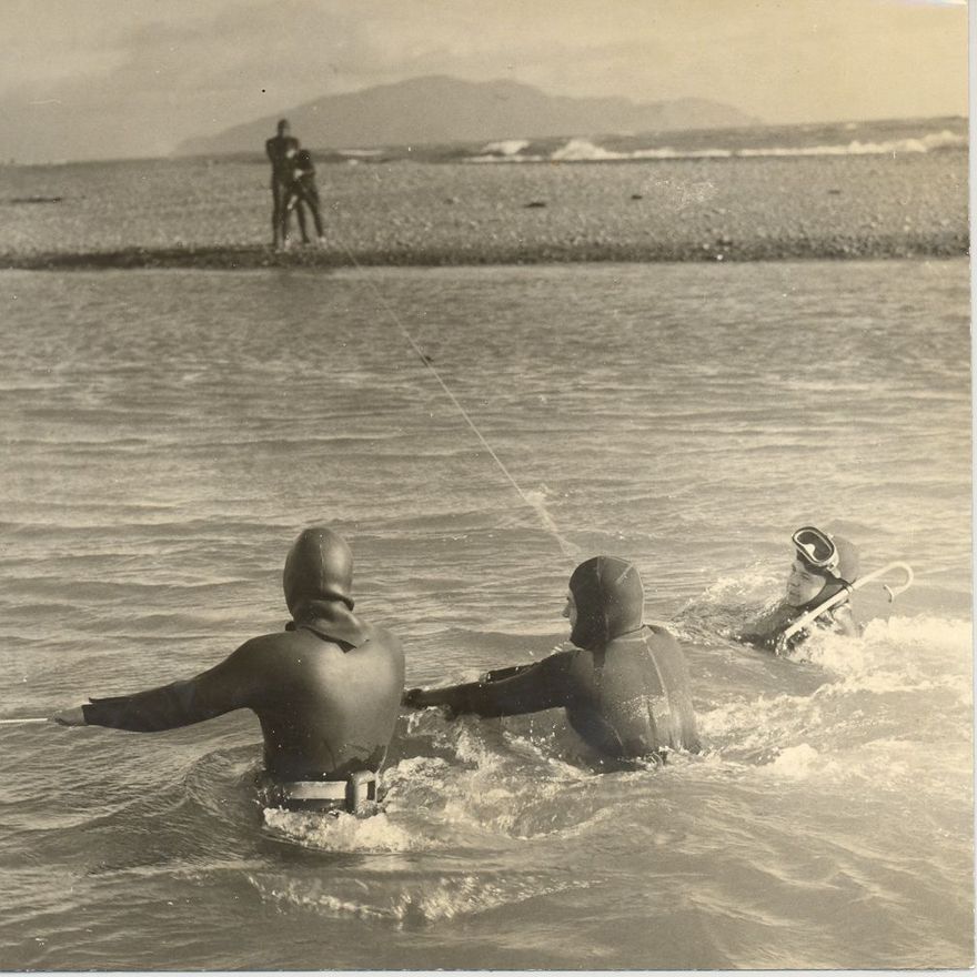 5 people (unidentified) wearing wetsuits at mouth of Otaki River. 1 B&W photo print