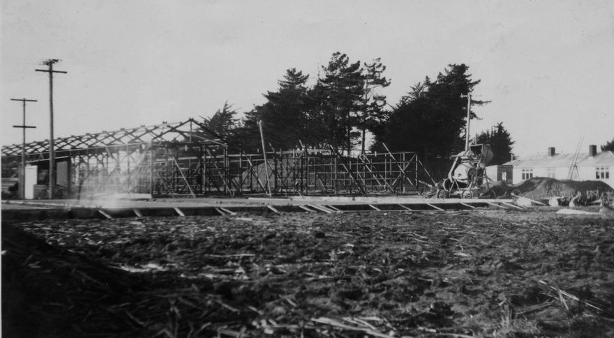 Site preparation for Woolpack and Textiles factory. This photograph shows the frame of the building. To the right of the photograph is a private dwelling.