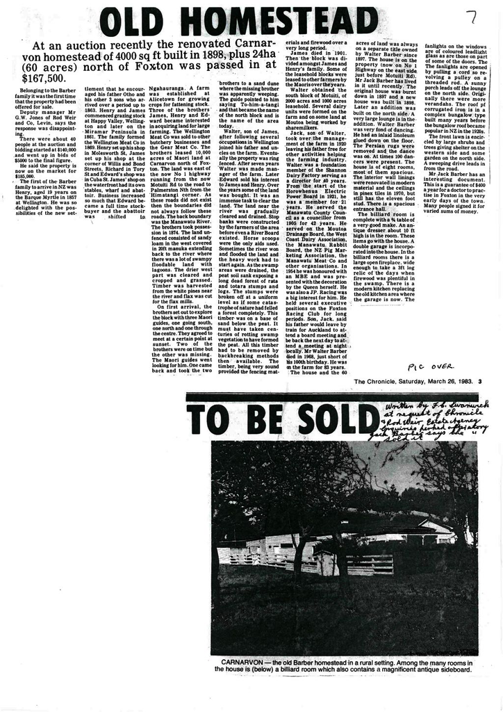 The house and the 60 acres of land was always on a separate title owned by Walter Barber since 1897. The house is on the property (now on No1 Highway on the east side, just before Motuiti Rd). Mr Jack Barber has lived in it until recently. The original house was burnt down in 1897 and a new house was built in 1898. Later an addition was built on the north side. A very large lounge is in the addition. Walter Barber was very fond of dancing. He had inlaid linoleum glued down on the floor. The Persian rugs were removed and the dance was on. At times 100 dancers were present. The house is of eight rooms, most of them spacious. The interior wall linings were renovated in modern material and the ceilings in pinex tiles in 1970, but still has the eleven foot stud. There is a spacious entrance hall.