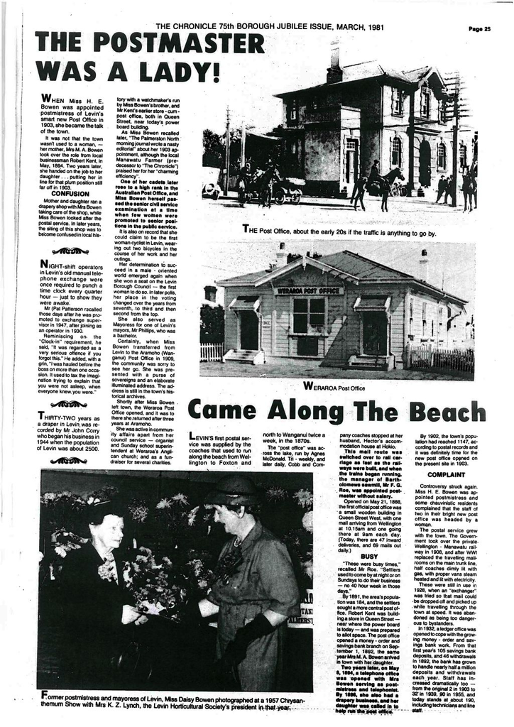 When Miss H.E. Bowen was appointed postmistress of Levin's smart new Post Office in 1903, she became talk of the town.