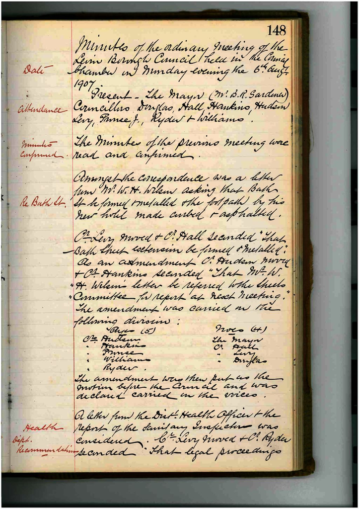 Amongst the correspondence was a letter from Mr W.H. Wilson asking that Bath Street be formed and metalled and the footpath by his new hotel made curbed and asphalted.
