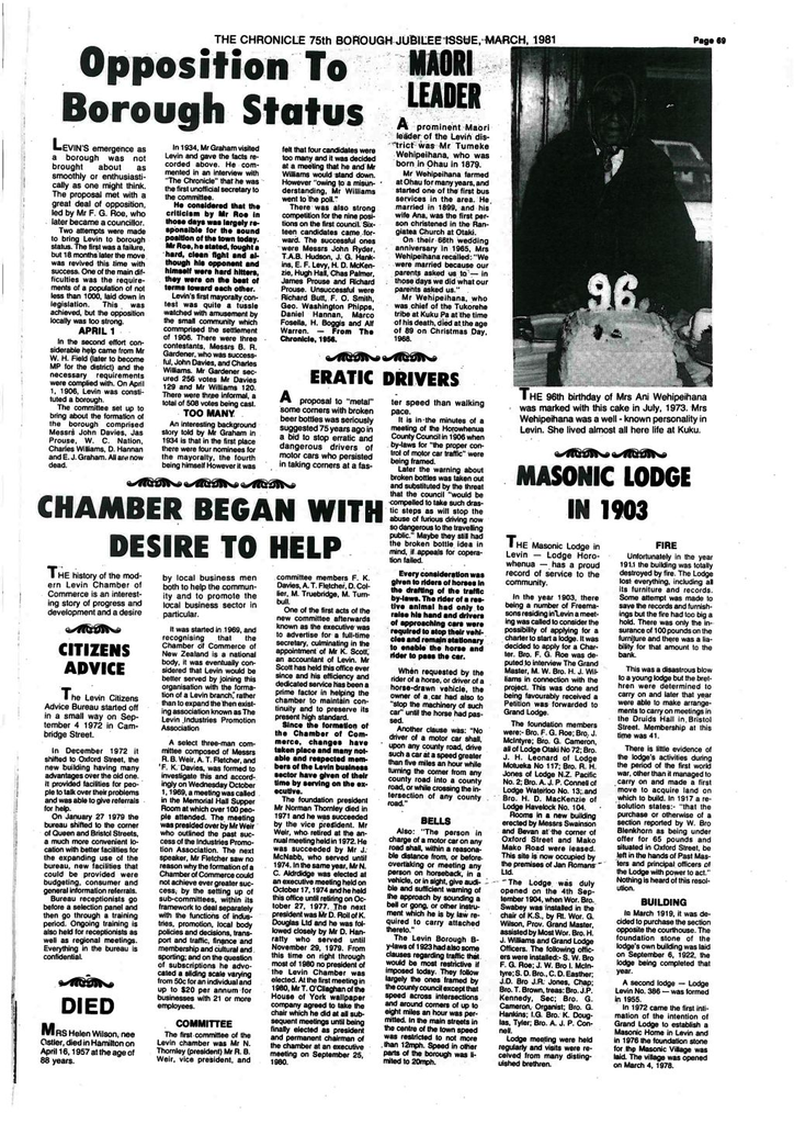 Levin's emergence as a borough was not brought about as smoothly or enthusiastically as one might think. The proposal met with a great deal of opposition, led by Mr F. G. Roe, who later became a councillor.