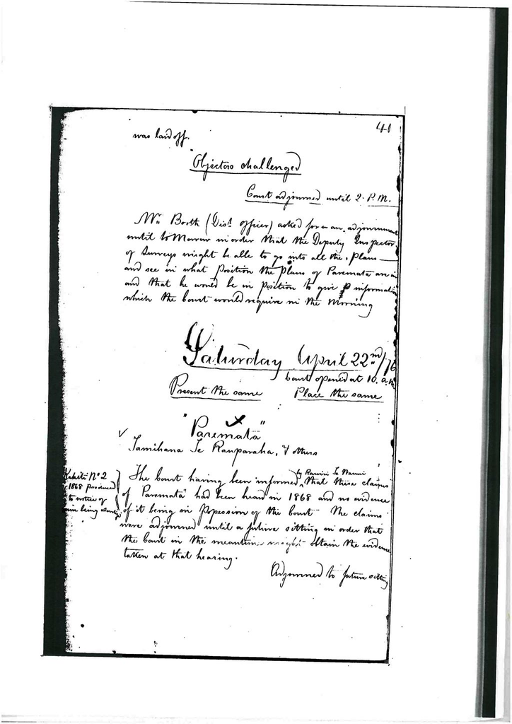The court having informed by Rawiri Te Wanui that these claims of Paremata had been in 1868 and no evidence of it being in possession of the court the claims were adjourned until a future sitting in order that the court in the meantime might obtain the evidence taken at that hearing. (Kapiti No.2 __ 1868 produced__ to notice of __ being advantage). Adjourned to future sitting.