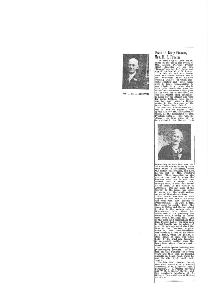 The late Mr. and Mrs. Procter were well known citizens and in 1947 celebrated their diamond wedding jubilee, at which ceremony sporting and civic heads were in large representation to pay tribute to a couple who in their quite unobtrusive ways had earned for themselves a high place in the civic life of the town, the late Mr. Procter being particularly noted for his interest and work for rugby football. Mrs. Procter was for many years a tireless worker in the interests of the Levin District High School.