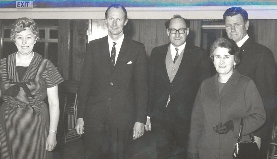 Penciled on back - Seen shortly before the presentation of the Duke of Edinburgh Awards to Horowhenua College Students. from left: Mrs J.M. Calvert, Horowhenua College senior mistress, Dr Randal Elliot, area award organiser, Mr A.F. Campbell College principal, Mr J.D. Easton, Chairman of the Board of Governors and Mrs Easton. Fri. Oct. 31, ‘69.