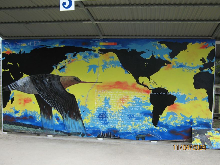 This is the mural I did for the 2009 Festival of Murals in Foxton.It shows the journey of the kuaka /godwit as a kind of dream.This is the bird "E7" which was tagged and folllowed across the Pacific in 2007.