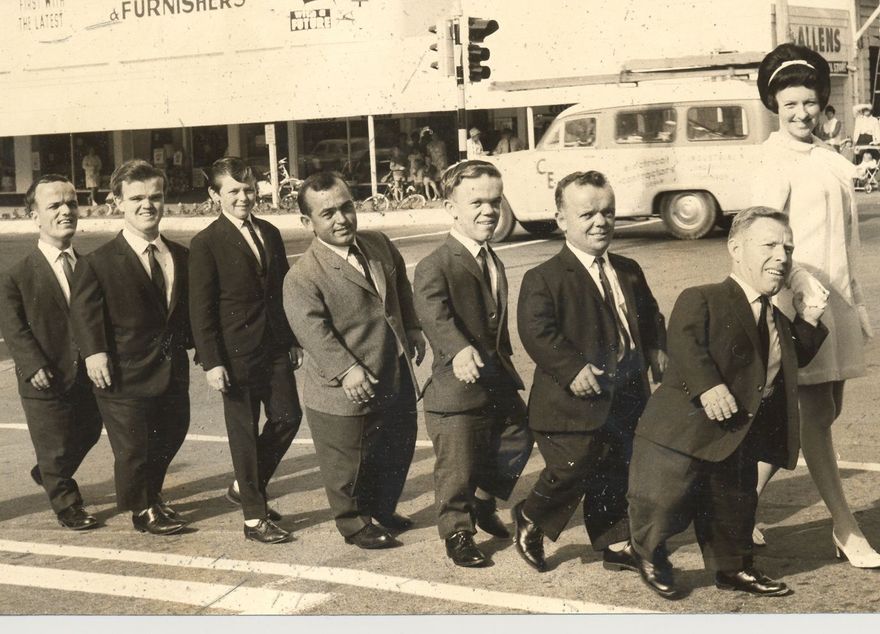 Left to Right – Graham Cottrell, Rob du Barry, Philip Bryant, Gordon Lavendar, Trevor Monk, Ray Burgess, George Whitaker & Joan Sharrat. Crossing Bath Street at Oxford Street intersection with A.W. Allens department store in background.