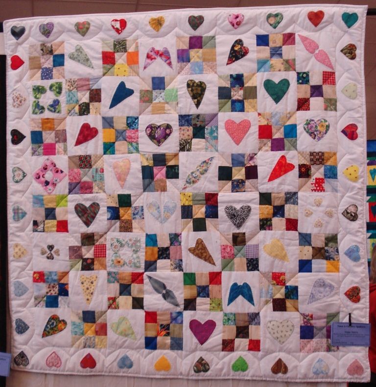 "Machine pieced and hand and machine quilting; playing with heart templates from different quilts". By Elizabeth Dennis.