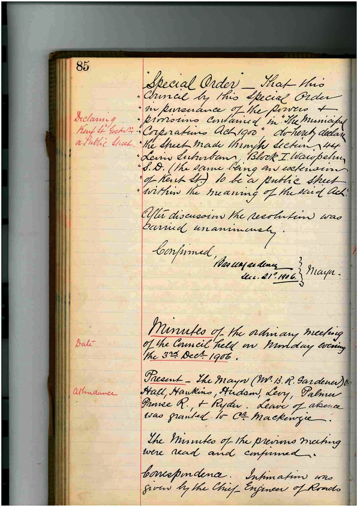 Cr. Hawkins moved the motion of which he had given notice, viz. “That the resolution passed by this Council in the 19th Nov. 1906 in regard to the taking over of Kent Street be rescinded, as such resolution was not legal, vide sec. 233 Municipal Corporations Act 1900.”