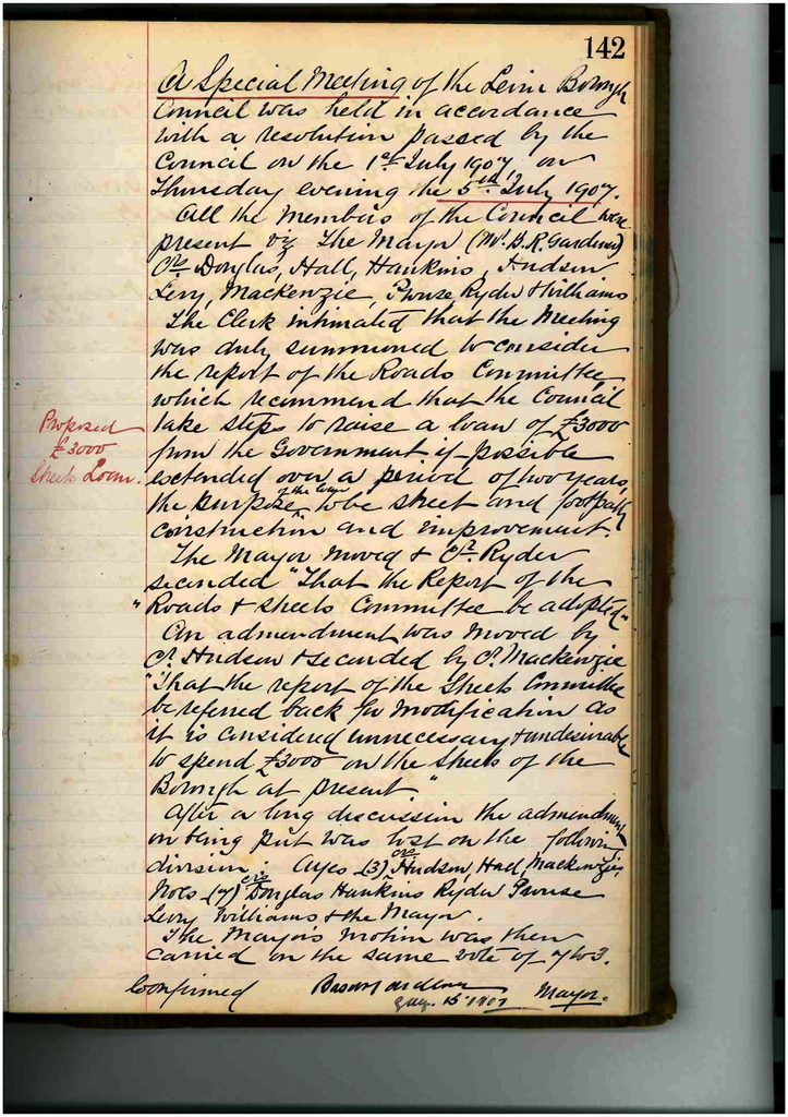 The Clerk intimated that the Meeting was duly summoned to consider the report of the Roads Committee which recommend that the Council take steps to raise a loan of £3,000 from the Government if possible extended over a period of two years the purpose of the loan to be street and footpath construction and improvement.