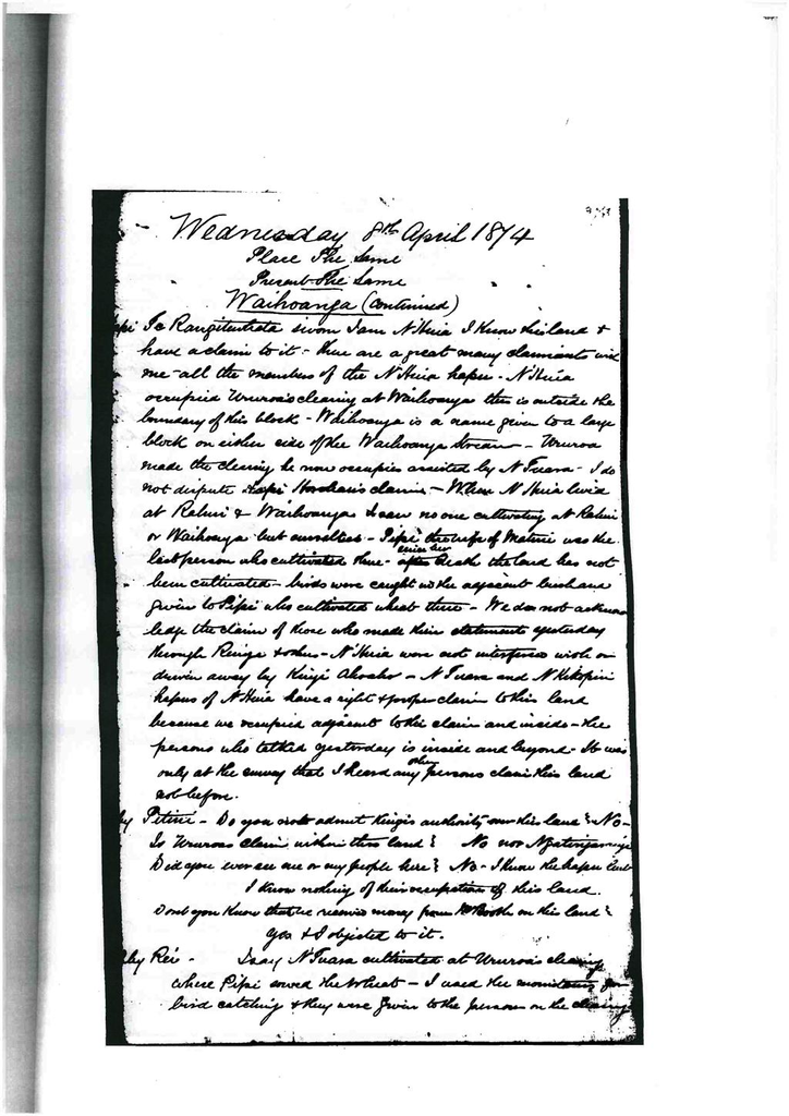 I do not dispute Hapi Horohau’s claim. When Ngati Huia lived at rahui and Waihoanga, I saw no one cultivating at Rahui or Waihoanga but ourselves. Pipi - the wife of Mate – was the last person who cultivated there. Since her death, the land has not been cultivated. Birds were caught in the adjacent bush and given to Pipi who cultivated wheat there. We do not acknowledge the claim of those who made their statement yesterday through Ringa and others.