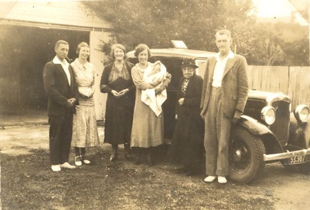The Astridge Family party at Masterton. Group Photo. Bill Plaster, Annie (nee Plaster) Mona, ?, Mrs Plaster (senior), ?.