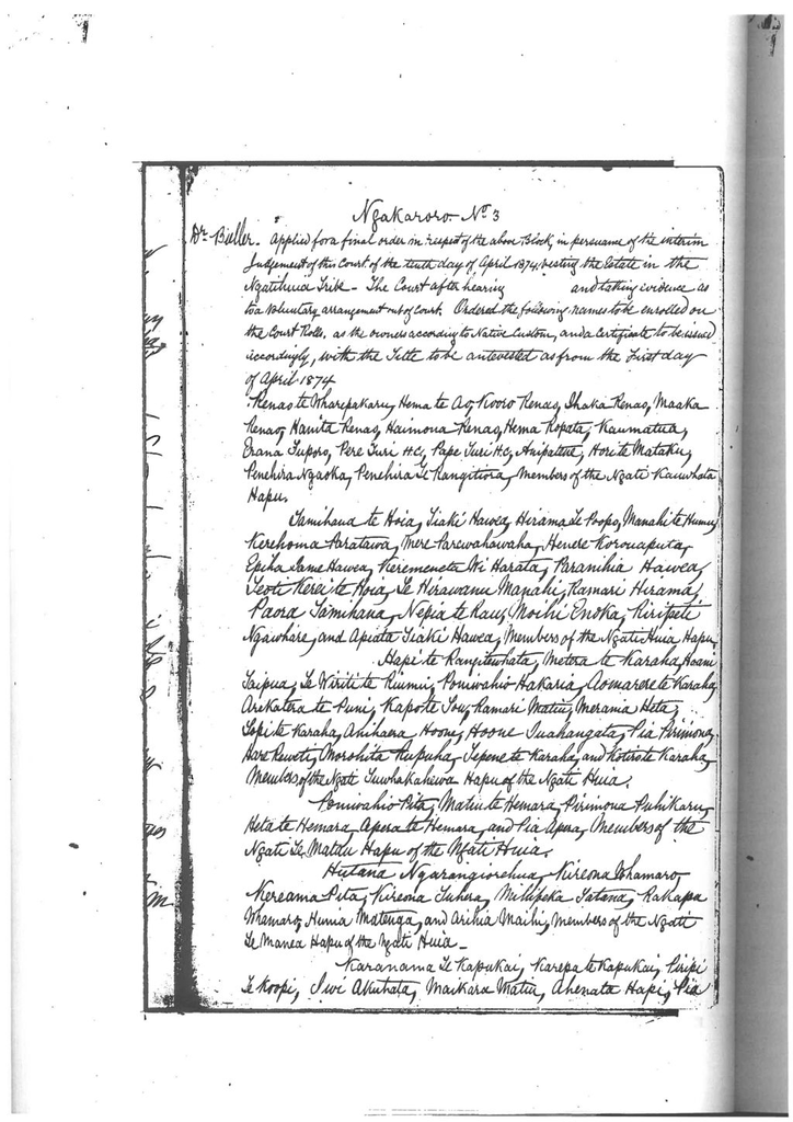 Dr Buller applied to have an order issued in favour of Unaiki Wi Parata, Hera Tuhangahanga, Mere Tiaki Hawea, Ruta Te Maanga, Wikitoria Amomai, Makareta Pineaha, Matapere Ropata, Eruera Te Whioi, Natanahira te Umutapa, Rawiri te Ruru, Winara te Puke, Maka Pukehi, Hirawanu Manahi for the above named block – No objectors.