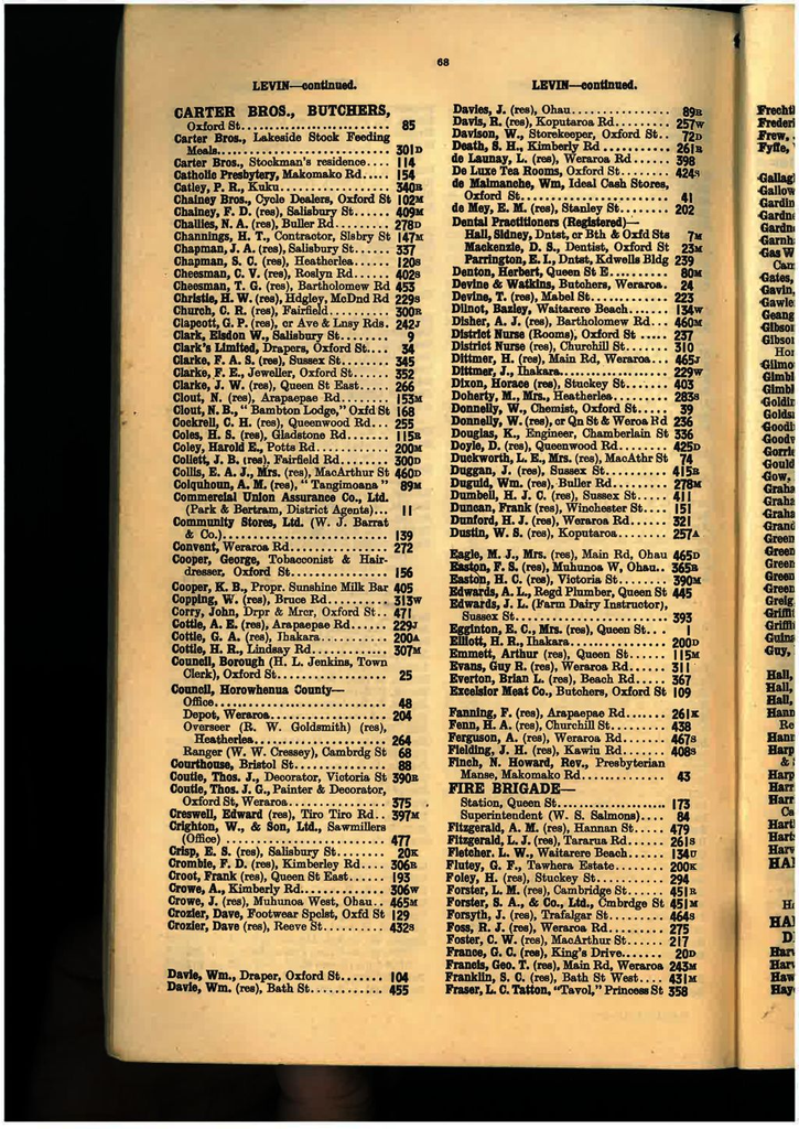 LEVIN--continued. CARTER BROS., BUTCHERS, Oxford St . 85 Carter Bros., Lakeside Stock Feeding Meals 301D Carter Bros., Stockman's residence. 114 Catholic Presbytery, Makomako Rd 154 Catley, P. R., Kuku 340R Chainey Bros., Cycle Dealers, Oxford St 102M Chainey, F. D. (res), Salisbury St 409M Challies, N. A. (res), Buller Rd 278D Channings, H. T., Contractor, Slsbry St 147M Chapman,J. A. (res), Salisbury St 337 Chapman, S. C. (res), Heatherlea 120S Cheesman, C. V. (res), Roslyn Rd 402S Cheesman, T. G. (res), Bartholomew Rd 453 Christie, H. W. (res), Hdgley, McDnd Rd 229S Church, C. R. (res), Fairfield 300R Clapcott, G. P. (res), cr Ave & Lnsy Rds 242J Clark, Elsdon W., Salisbury St 9 Clark's Limited, Drapers, Oxford St 34 Clarke, F. A. S. (res), Sussex St 345 Clarke, F. E., Jeweller, Oxford St 352 Clarke, J. W. (res), Queen St East 266 Clout, N. (res), Arapaepae Rd 153M Clout, N. B.," Bambton Lodge," Oxfd St 168 Cockrell, C. H. (res), Queenwood Rd. 255 Coles, H. S. (res), Gladstone Rd 115R Coley, Harold E., Potts Rd 200M Collett, J. B. (res) Fairfield Rd 300D Collis, E. A. J., Mrs. (res), MacArthur St 460D Colquhoun, A. M. (res), " Tangimoana " 89M Commercial Union Assurance Co., Ltd. (Park & Bertram, District Agents) 11 Community Stores, Ltd. (W. J. Barret & Co.) 139 Convent, Weraroa Rd 272 Cooper, George, Tobacconist & Hairdresser, Oxford St 156 Cooper, K. B., Propr. Sunshine Milk Bar 405 Copping, W. (res), Bruce Rd 313W Corry, John, Drpr & Mrcr, Oxford St 471 Cottle, A. E. (res), Arapaepae Rd 229J Cottle, G. A. (res), Ihakara 200A Cottle, H. R., Lindsay Rd 307M Council, Borough (H. L. Jenkins, Town Clerk), Oxford St 25 Council, Horowhenua County— Office 48 Depot, Weraroa 204 Overseer (R. W. Goldsmith) (res), Heatherlea 264 Ranger (W. W. (Jressey), Cambrdg St 68 Courthouse, Bristol St 88 Coutie, Thos. J., Decorator, Victoria St 390R Coutie, Thos. J. G., Painter & Decorator, Oxford St, Weraroa 375 Creswell, Edward (res), Tiro Tiro Rd 397M Crighton, W., & Son, Ltd., Sawmillers 477 (Office) Crisp, E. S. (res), Salisbury St 20K Crombie, F. D. (res), Kimberley Rd 306R Croot, Frank (res), Queen St East 193 Crowe, A., Kimberly Rd. 306W Crowe, J. (res), Muhunoa West, Obau 465M Crozier, Dave, Footwear Spclst, Oxfd St 129 Crozier, Dave (res), Reeve St 432S Davie, Wm., Draper, Oxford St 104 104 Davie, Wm. (roe), Bath St 455 455 Davies, J. (res), Ohau 89S Davis, R. (ms), Koputaroa Rd 257W Davison, W., Storekeeper, Oxford St 72D Death, S. H., Kimberly Rd 261R de Launay, L. (res), Weraroa Rd 398 De Luxe Tea Rooms, Oxford St 424S de Malmanche, Wm, Ideal Cash Stores, Oxford St 41 de Mey, E. M. (res), Stanley St 202 Dental Practitioners (Registered)— Hall, Sidney, Dntst, cr Bth & Oxfd Sts 7M Mackenzie, D. S., Dentist, Oxford St 23M Parrington, E. L, Dntst, Kdwells Bldg 239 Denton, Herbert, Queen St E. 8011 80M Devine & Watkins, Butchers, Weraroa 24 Devine, T. (res), Mabel St 223 Dilnot, Baziey, Waitarere Beach 134W Disher, A. J. (res), Bartholomew Rd 460M District Nurse (Rooms), Oxford St 237 District Nurse (res), Churchill St 310 Dittmer, H. (res), Main Rd, Weraroa 465J Dittmer, J., Ihakara 229W Dixon, Horace (res), Stuckey St 403 Doherty, M., Mrs., Heatherlea 283S Donnelly, W., Chemist, Oxford St 39 Donnelly, W. (res), cr Qn St & Weroa Rd 236 Douglas, K., Engineer, Chamberlain St 336 Doyle, D. (res), Queenwood Rd 425D Duckworth, L. E, Mrs. (res), MacAthr St 74 Duggan, J. (roe), Sussex St 415R Duguid, Wm. (res), Buller Rd 278M Dumbell, H. J. C. (res), Sussex St 411 Duncan, Frank (roe), Winchester St 151 Dunford, H. J. (res), Weraroa Rd 321 Dustin, W. S. (res), Koputaroa 257A Eagle, M. J., Mrs. (res), Main Rd, Ohau 465D Easton, F. S. (res), Muhunoa W, Ohau 365R Easton, H. C. (res), Victoria St 390M Edwards, A. L., Regd Plumber, Queen St 445 Edwards, J. L. (Farm Dairy Instructor), Sussex St 393 Egginton, E. C., Mrs. (res), Queen St.. 1 1 Elliott, H. R., Ihakara 200D Emmett, Arthur (res), Queen St 115M Evans, Guy R. (res), Weraroa Rd 311 Everton, Brian L. (res), Beach Rd 367 Excelsior Meat Co., Butchers, Oxford St 109 Fanning, F. (res), Arapaepae Rd 261K Fenn, H. A. (res), Churchill St 438 Ferguson, A. (res), Weraroa Rd 467S Fielding, J. H. (res), Kawiu Rd 408S Finch, N. Howard, Rev., Presbyterian Manse, Makomako Rd 43 FIRE BRIGADE— Station, Queen St. 173 Superintendent (W. S. Salmons) 84 Fitzgerald, A. M. (res), Hannan St 479 Fitzgerald, L. J. (res), Tararua Rd 261S Fletcher. L. W., Waitarere Beach 134U Flutey, G. F., Tawhera Estate 200K Foley, H. (res), Stuckey St 294 Forster, L. M. (res), Cambridge St 451R Forster, S. A., & Co., Ltd., Cmbrdge St 451M Forsyth, J. (res), Trafalgar St 464S Foss, R J. (res), Weraroa Rd 275 Foster, C. W. (res), MacArthur St 217 France, G. C. (res), King's Drive 20D Francis, Geo. T. (res), Main Rd, Weraroa 243M Franklin, S. C. (res), Bath St West 431M Fraser, L. C. Tatton, "Tavol," Princess St 358