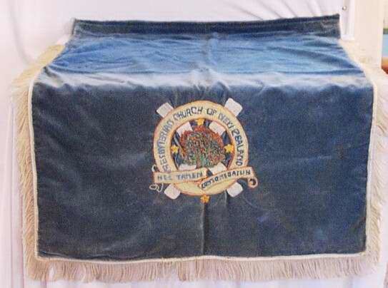 In 1962 the interior of the Presbyterian Church was being renovated with new furnishings. Mrs Audrey Willing made this pulpit fall which was used in the church until June 1970 when the Foxton Union Parish was formed.