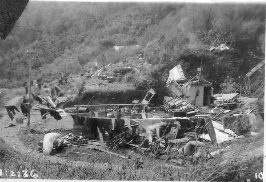 Severe storm damage to camp (Lower Mangahao Dam). Cookhouse (foreground) destroyed. Empty terrace (centre) where tents used to be, blown away.
