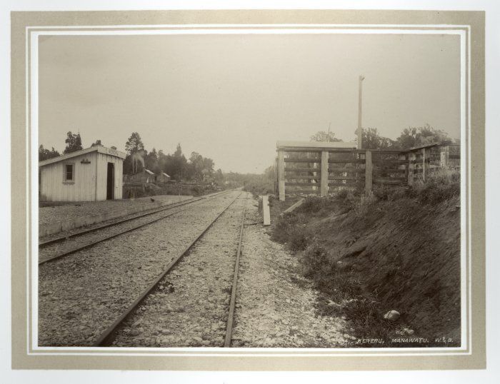 View of Kereru (now called Koputaroa), showing the Wellington & Manawatu Railway station and track. Photograph taken between 1885 and 1888 by Wrigglesworth & Binns of Wellington. Note the insulators for the recently-installed telephone on the side of the station.