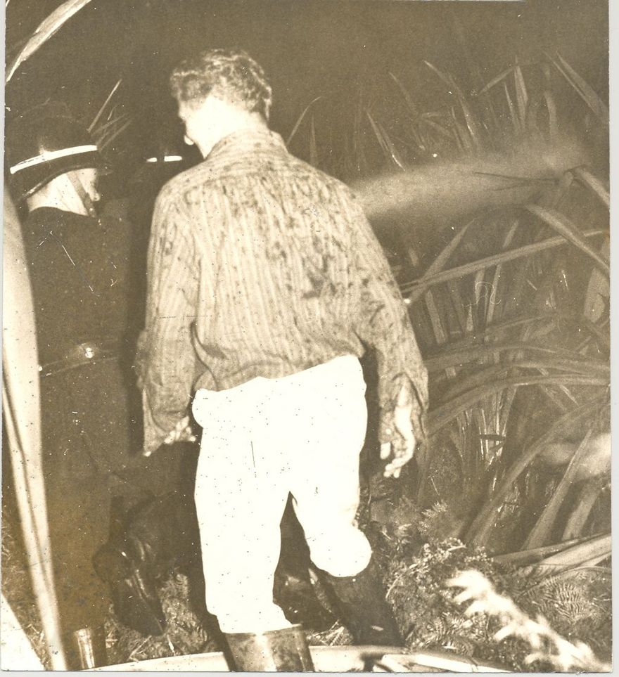 Taken at night. A Levin Volunteer fire brigadesman (left, unidentified) plays water on burning flax during a bush fire in the Arawhata Swamp. Man (centre, unidentified) talking to volunteer fire brigadesman, offering assistance ?
